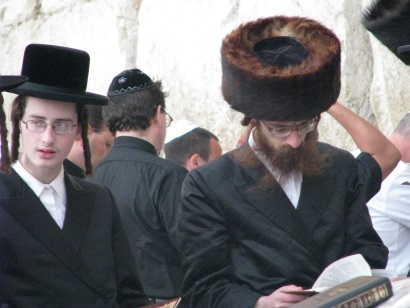 loin un groupe d’hommes, coiffés de Shtreimel (une coiffe bordée de fourrure) et