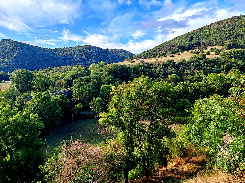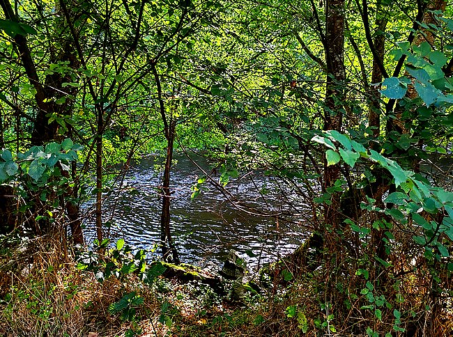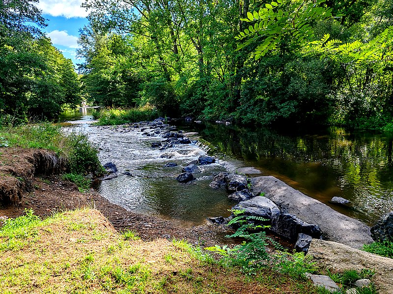 Voilà, je continue pour aller vers Blesle avec d'un côté la voie ferrée et de l'autre côté la rivière. J'arrive à une aire de repos le Site des Trois eaux à Blesle. Ce site présente la confluence de trois
