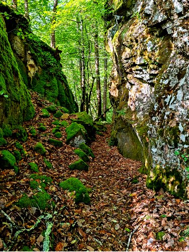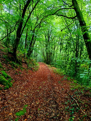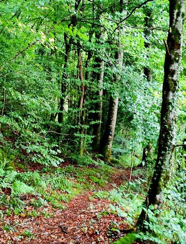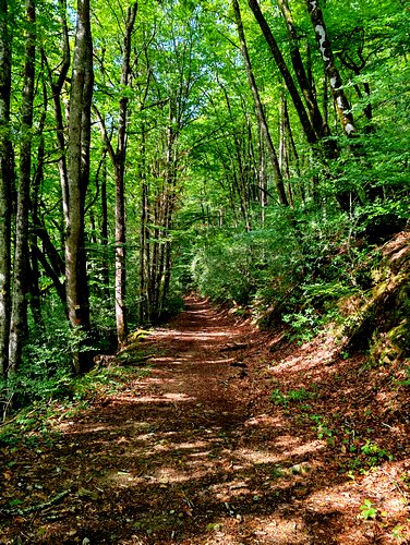 heure en suivant un chemin qui descend en lacets au milieu d'une belle forêt et