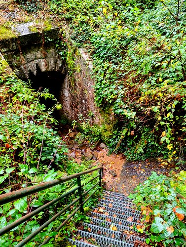 descends des escaliers pour passer dans un petit tunnel sous la voie ferrée et