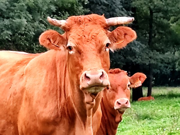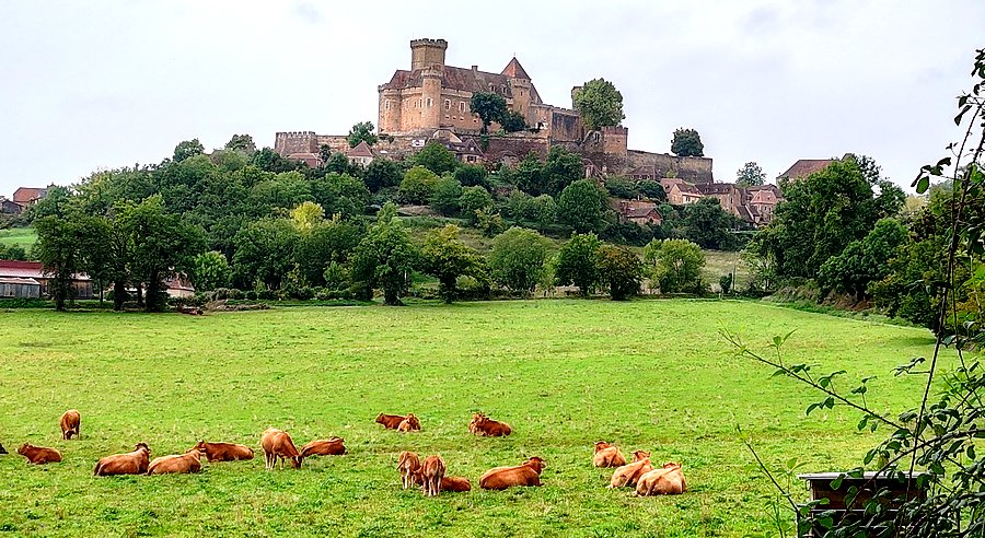 Petite étape avec un gros dénivelé en fin d'étape. Après une nuit en pointillé, je quitte le camping à 8h. La petite ville de Bretenoux est encore toute endormie après la fiesta d'hier soir (Bal et feu d'artifice). Les premiers êtres vivants que je rencontre ce sont nos chères vaches qui ont passé la nuit dans les prés.