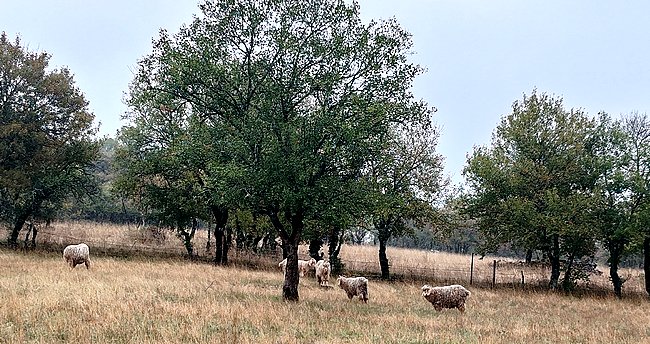 prochain trail. J'arrive à un point haut où il y a un grand verger de noyers et également beaucoup de pommiers. Je rencontre un chasseur qui attend ses