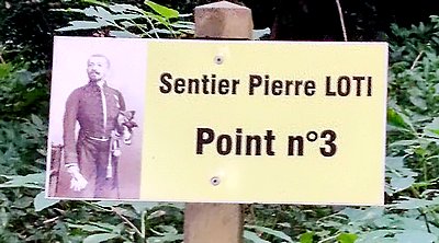 Après être sorti de la localité, je prends un chemin qui passe entre les pâturages et qui grimpe doucement à travers la forêt. Il se transforme en un sentier qui s'appelle le sentier de Pierre Loti, écrivain français qui venait passer ses vacances d'été à Bretenoux. Ce sentier va grimper pendant un moment au milieu d'une belle
