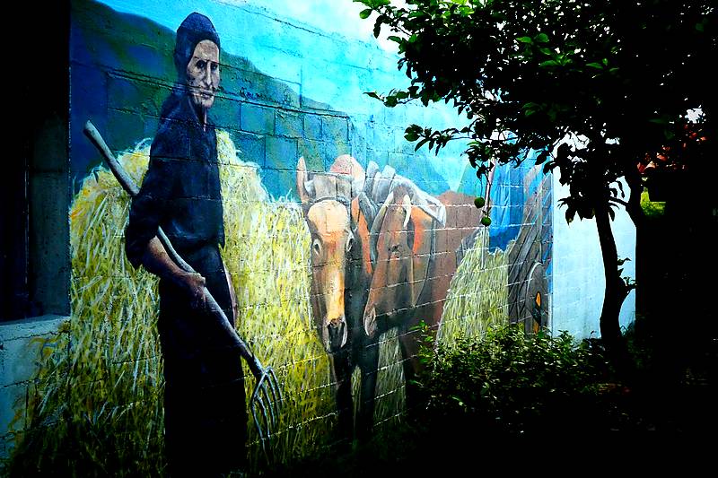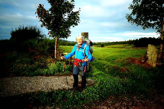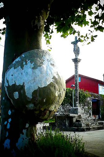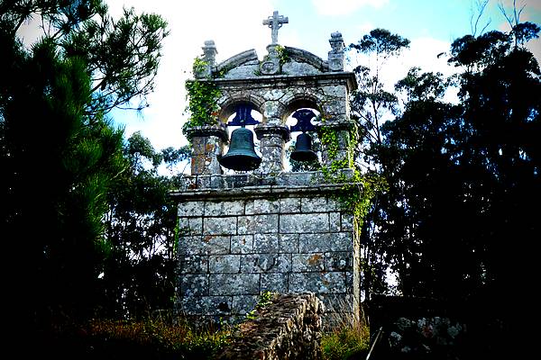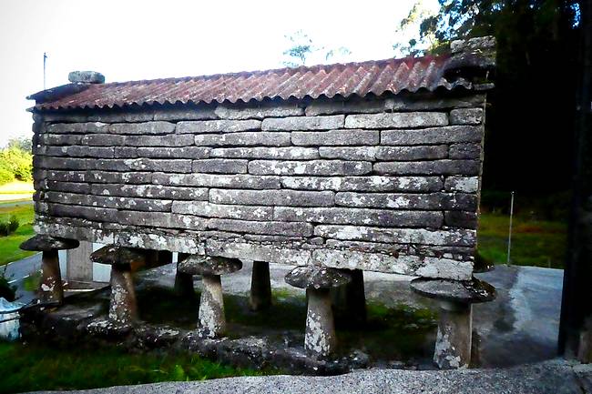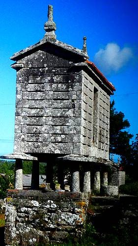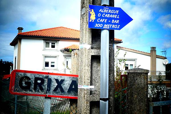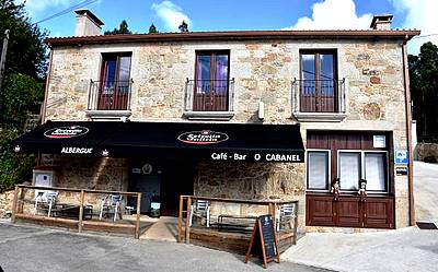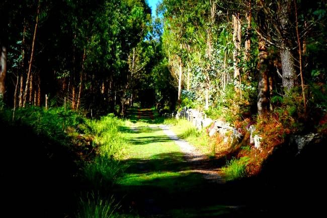 Ensuite je prends une piste en assez forte descente qui rejoint la route et après 200 m je vais prendre une piste forestière qui descend assez raide au milieu d'un bois de chênes et ensuite, elle rejoint une petite route. Plus loin, j'emprunte un joli chemin bordé de murets qui atterrit sur une large piste qui traverse un bois composé d'une végétation assez variée. J'arrive sur une route, il y a à droite un stade où j'entends des enfants jouer, il y a des bâtiments modernes et j'entre dans Dumbría dont j'aperçois sur la hauteur le clocher de l'église. Je traverse cette localité qui est plutôt jolie avec ses maisons repeintes. Je pense que ce sont plutôt des résidences secondaires. Je m'attendais à trouver un bar, mais rien d'ouvert ! Je fais une pause en m'asseyant sur un banc en face du Centro de Salud. Je quitte la localité en suivant une petite route, puis un petit chemin. Je passe sur un pont qui enjambe un ruisseau, je traverse une route et j'arrive sur une piste au milieu d'un bois d'eucalyptus avec quelques pins ici ou là... Je suis cette piste au milieu d'une belle forêt pendant un long moment, jolie piste herbeuse, recouverte par moment de feuilles d'eucalyptus et bordée de murets. Cette forêt est composée de multiples essences, mais principalement ce qui a dejà été décrit plus haut, pins, eucalyptus, fougères, genêts et un peu de bruyère.... Cette piste après quelques bons dénivelés surtout en descente arrive sur une route qui mène à une petite localité. Je prends une nouvelle route goudronnée qui arrive rapidement sur un vaste espace agricole où on retrouve les champs de maïs et les prés. Un peu plus loin, j'entre dans une autre localité avec les panneaux à l'entrée indiquant Grixa et l'Albergue O Cabanel où j'ai réservé une chambre. Le temps est resté assez frais tout au long de l'étape et en arrivant il y a quelques nuages dans le ciel. |
