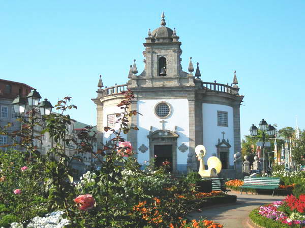 L'église Matriz entourée de jardins avec le coq emblême de Barcelos