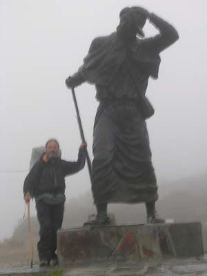 Je me lève à 6h. J'attends un peu qu'il fasse jour. Il pleut et il y a de la brume. Je pars avec Kärin, la danoise, sous un crachin qui fait penser à la Bretagne. Le chemin n'arrête pas de monter et de descendre et nous sommes content de pouvoir nous arrêter dans un café pour nous réchauffer et nous sécher un peu. Là, nous retouvons Karlsten qui nous laisse ensuite pour partir devant nous. Nous passons au col de San Roque où se trouve une grande statue de pèlerin, puis au point le plus haut, au col de l'Alto de Poio (1337 m). Ensuite, c'est le début d'une longue descente jusqu'à Triacastela en suivant des chemins bordés de fougères et d'ajoncs, en croisant des troupeaux de vaches, et en traversant plusieurs hameaux typiques de la Galice. Sur la fin de l'étape, je commence à fatiguer et je m'arrête à la première albergue. Kärin préfère continuer jusqu'à Samos. Je dîne avec Karlsten et un couple d'italiens, Rosa et Domenico.