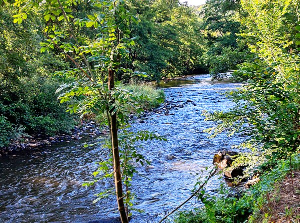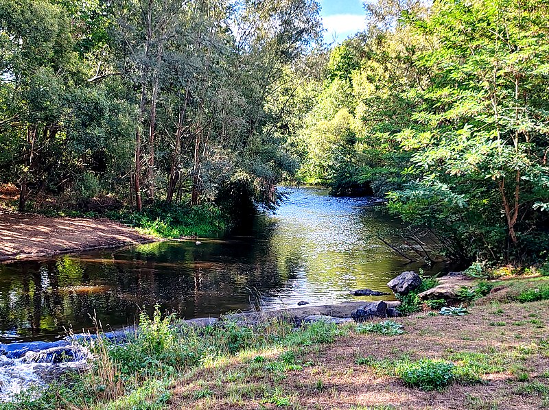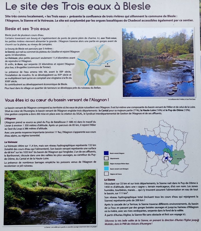Voilà, je continue pour aller vers Blesle avec d'un côté la voie ferrée et de l'autre côté la rivière. J'arrive à une aire de repos le Site des Trois eaux à Blesle. Ce site présente la confluence de trois