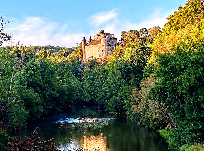trouve au bord de la rivière l'Alagnon qui va m'accompagner toute la matinée. Le ciel est bleu, au loin je vois un château éclairé par le soleil qui se reflète dans la rivière et je prends une petite route le long de cette rivière. C'est un matin enchanteur, un matin où l'on se sent bien, où l'on a envie de communier avec la nature, de chanter et de danser... Pour moi, ce sera plutôt des incantations poétiques...