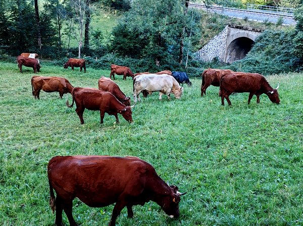 une petite route tranquille qui passe au milieu des pâturages et continue ensuite par un chemin qui longe la voie ferrée et plus bas la rivière la Cère. Je m'arrête un moment pour parler avec un paysan qui est en train de sortir ses vaches pour