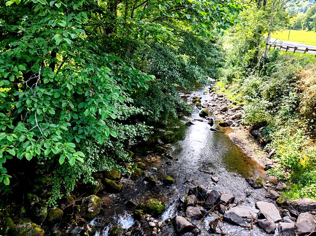 J'entre dans Vic-sur-Cère en suivant une piste piétonnière le long d'un ruisseau qui se jette plus loin dans la Cère.