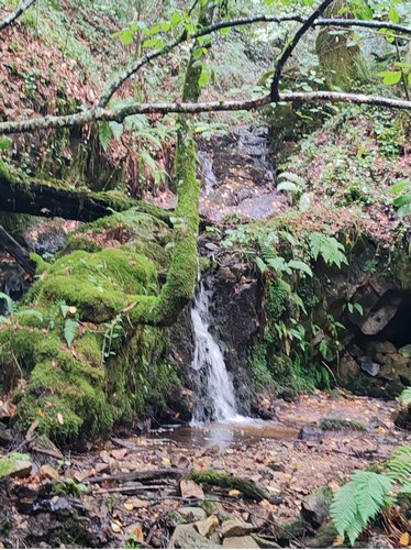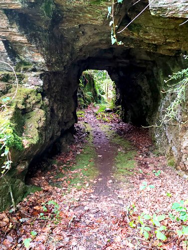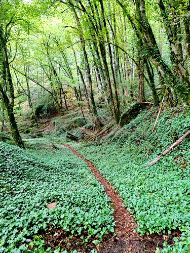 heure en suivant un chemin qui descend en lacets au milieu d'une belle forêt et
