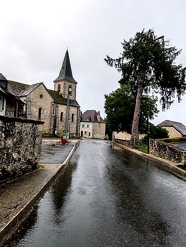 En effet, il a plu une partie de la nuit et il continue de pleuvoir quand je mets le nez dehors. Je me faisais une joie de parcourir cette étape le long des gorges de la Cère et avec cette pluie, je me demande si ce sera possible. Je quitte le studio à 7h30 et je descends au centre de Laroquebrou.