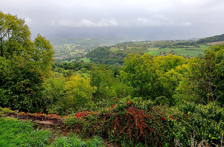 prochain trail. J'arrive à un point haut où il y a un grand verger de noyers et également beaucoup de pommiers. Je rencontre un chasseur qui attend ses