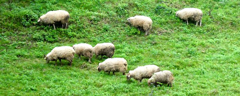 Je sors à 7h de la Pension. Le bar que mon hôtesse m'avait indiqué comme étant ouvert de bonne heure est fermé. J'achète à un kiosque à jounaux de l'eau et un jus d'orange et je m'assied sur un banc pour un semblant de petit-déjeuner avec une barre de céréales que j'ai toujours en réserve. Je monte vers l'église Saint-Jean Baptiste située sur une belle place, je passe sous une arche et après une descente en escaliers, je me trouve dans une zone de circulation entre autoroute et voie ferrée. Heureusement, assez rapidement j'arrive dans un sous-bois sur une petite route qui longe un arroyo. C'est vert et tranquille. Le temps est nuageux et humide, mais pas de menace de pluie.