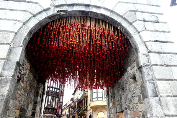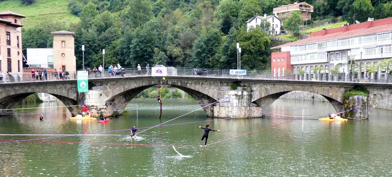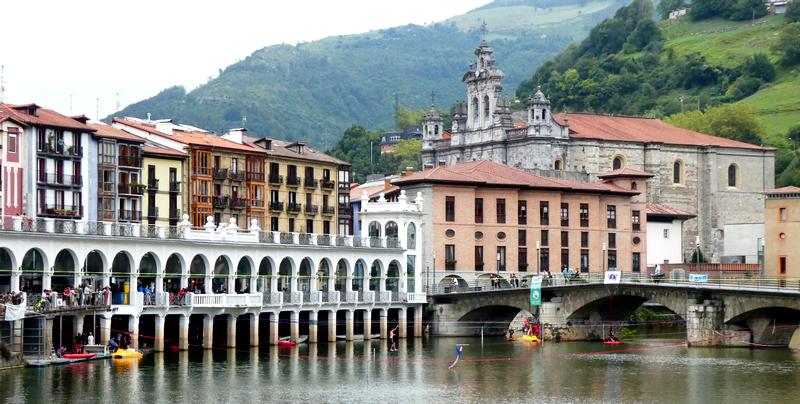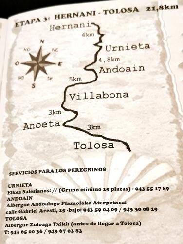 J'arrive à Tolosa vers 14h et après un verre de vino blanco et des tapas dans un bar, je vais directement à l'Hostal où j'ai réservé une chambre. Le patron qui m'accueille est sympathique. Je vais prendre un bon temps de repos avant d'aller visiter cette cité qui est très animée en ce samedi soir. Je vais du côté du Tinglado, cet ancien marché du 18ème siècle le long du rio Oria. Il y a beaucoup de monde et des jeunes s'exercent à marcher sur des filins tendus au-dessus de la rivière. Je trouve ensuite une taberna où je bois un apéritif en attendant le dîner servi à 20h30. Puis retour à l'Hostal et dodo à 22h00.