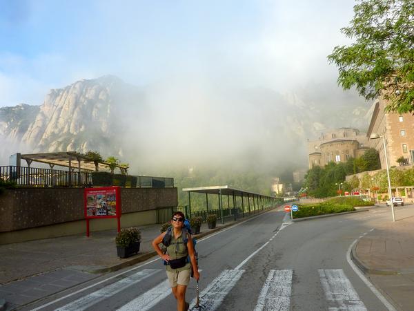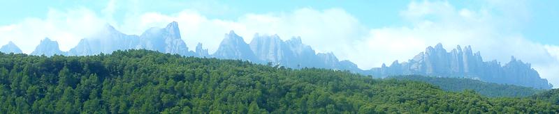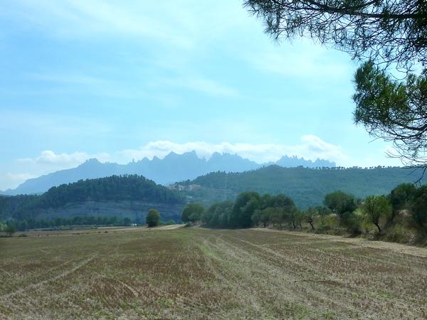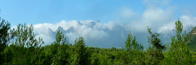 En s'éloignant de Montserrat, on aperçoit dans la brume les montagnes...