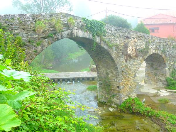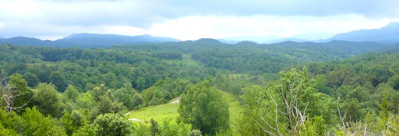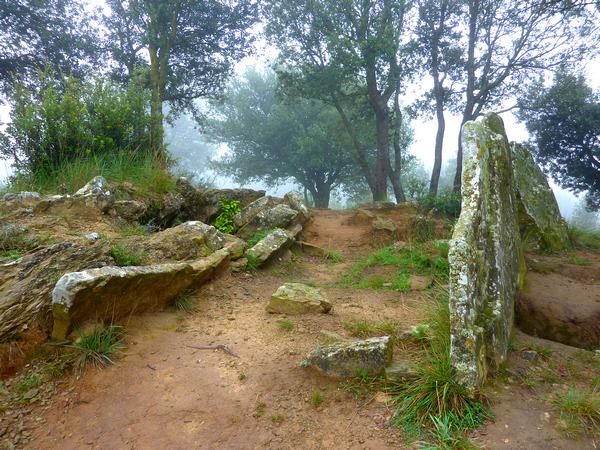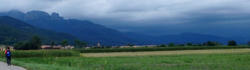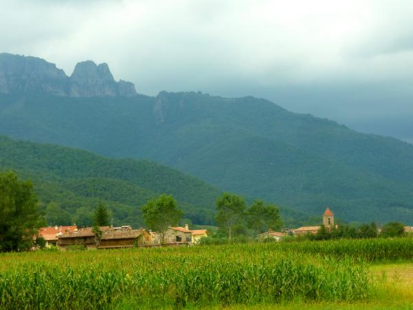 Après un bon petit-déjeuner à la Pension, on est tous les quatre sur le chemin à 8h. Après ce beau pont, à la sortie de l'Esquirol, je laisse mes compagnons partir d'un bon pas pendant que je marche tranquillement au milieu d'une nature qui prête à la rêverie... Premier arrêt au Dolmen de Puigsespedres qui d'après les vestiges visibles permet d'en imaginer les véritables dimensions...Puis arrivant à Cantonigros, j'aperçois au loin mes compagnons sans me douter qu'ils vont prendre une direction qui va les éloigner d'une dizaine de kilomètres de l'itinéraire de cette étape ! Je les ai perdu de vue et je prends la direction que me suggère le guide, à savoir traverser ce village-rue de part en part. A la sortie, après quelques hésitations et les indications d'un cycliste, je trouve le bon chemin qui va s'avérer très pittoresque, tantôt le long de sentiers ombragés, tantôt larges pistes sur des rochers plats avec sur la gauche la masse impressionnante des falaises d'Aiats ! Je reçois un appel de Marc puis Jacques qui me font part de leur mésaventure (Après 3 heures de marche ils sont presque retournés au point de départ !). Finalement un Catalan va les ramener en voiture après Cantonigros et ils me rejoignent une heure plus tard alors que je fais ma sieste à l'ombre d'un chêne. La suite du chemin est plutôt chaotique entre les différents itinéraires mal balisés où malgré l'attention que l'on peut porter aux indications sur les panneaux, on ne peut éviter de faire un grand détour qui heureusement nous amène à une auberge "Le Mas Coll de Dalt" où l'on est bien accueilli et où l'on va se restaurer...Nous prenons ensuite une petite route en lacets qui descend au milieu d'une forêt jusqu'à Els Hostalets d'en Bas. A mi-parcours, il y a une belle fontaine avec une eau claire, surmontée d'étranges sculptures où je vais me rafraîchir car le temps est à l'orage et il fait lourd. La fin de la descente est un peu dangereuse, glissante et pierreuse. Enfin nous arrivons avant la pluie à l'Hostalets. On s'arrête dans un bar et je téléphone à l'Auberge La Vall d'en Bas que je n'ai pas réussi à joindre depuis hier. Heureusement, la jeune fille qui tient ce bar va s'occuper de nous. Elle téléphone à l'Auberge pour prévenir de notre arrivée et comme la pluie tombe fort, elle nous propose de nous emmener en voiture jusqu'à Sant Esteve d'en Bas où se trouve cette auberge. C'est un hébergement neuf et vaste où l'on a 2 chambres, avec dîner et petit-déjeuner sur place.