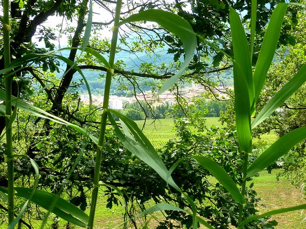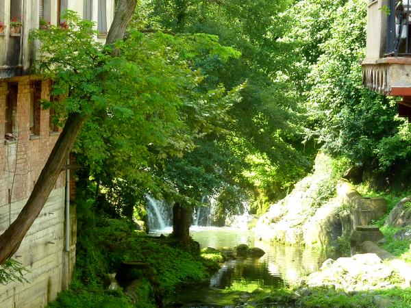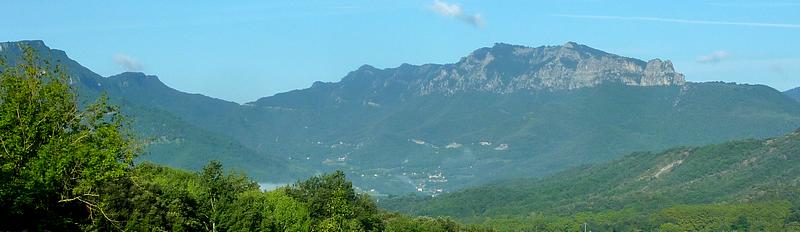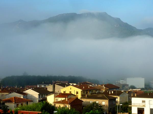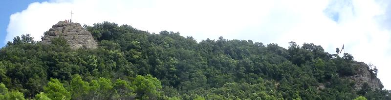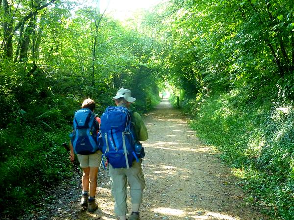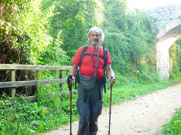 Aujourd'hui, l'itinéraire suit la Via Verde, ancienne ligne de chemin de fer, bien balisée, ombragée, qui se faufile entre des escarpements rocheux et des gorges à la végétation luxuriante. C'est vraiment un beau chemin, en pente douce et dont le sol est sablonneux...On croise quelques cyclistes qui semblent être des habitués de ce parcours. Nous faisons une première pause à Sant Feliu de Pallerols où se remarque à l'entrée au bord de la rivière, la statue du pêcheur de lune. On boit un verre et mange un en-cas dans un bar, puis petite visite de ce beau village avec un centre historique admirable ! Ensuite retour sur la Via Verde qui devient peu à peu monotone, malgré l'environnement spectaculaire de part et d'autre...Je laisse Paule et Marc prendre un peu d'avance. Jacques quant à lui est loin devant... Je prends quelques moments de repos, le temps de rafraîchir les pieds et je profite de ce parcours facile pour apprendre quelques nouveaux poèmes... Nouvel arrêt à Les Planes d'Hostoles pour boire un Coca, reprendre quelques forces avant d'aborder les derniers 8 km jusqu'à Amer où je rejoins Marc et Paule vers 16 h. Comme nous n'avons pas trouvé d'hébergement dans cette localité nous avons décidé d'aller jusqu'à Anglès en prenant un taxi. Nous sommes logés dans un hôtel dans des chambres à 2 lits. Jacques qui n'a pas pris de taxi nous rejoint un peu plus tard... Le soir dîner dans une cafétéria où de nombreux supporters assistent à un match du Barça. Bon dîner et Patxaran pour finir...