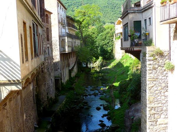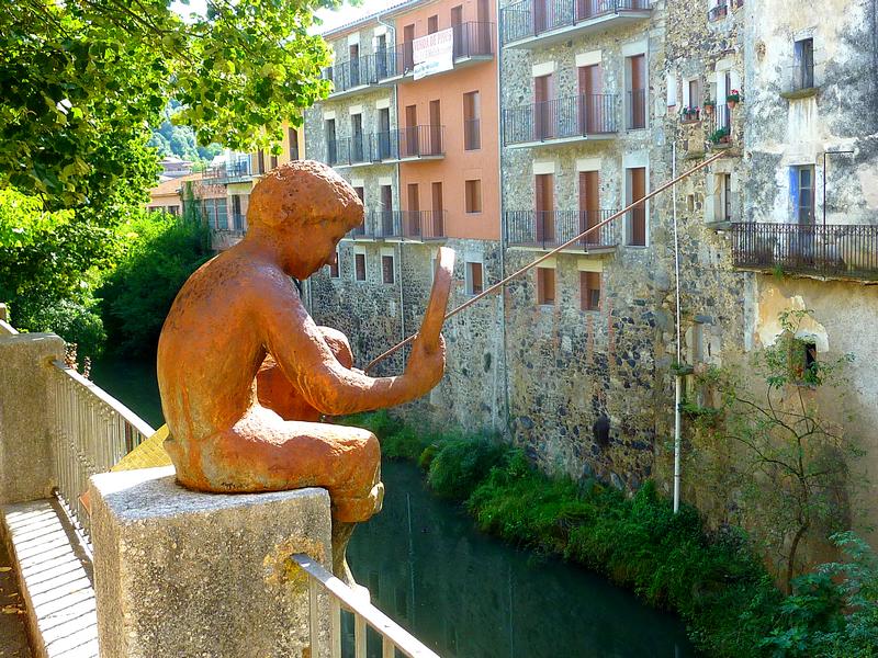 Sant Feliu de Pallerols est l’un des bourgs les plus intéressants de l’itinéraire. Arpenter l’enchevêtrement de rues de son centre historique est un véritable voyage dans le temps. Les nombreux touristes en excursion, appareil photo en main, ne s’y trompent pas ; touristes auxquels il faut ajouter le flux de visiteurs apportés par le passage en ce lieu de la voie verte. La rivière Brugent fend Sant Feliu en deux et donne au village les accents d’un lieu idyllique. La rumeur de l’eau réjouit l’âme, c’est sûr, et le fait que plusieurs rues donnent sur l’eau ne fait que renforcer le charme du bourg. Sur l’une des rives, on peut apercevoir la sculpture du pescalluna, le pêcheur de lune. La légende — comme dans d’autres villages catalans — raconte qu’une nuit de pleine lune, un habitant du village vit la lune se refléter dans la Brugent. Ébloui par une telle beauté, il essaya de la pêcher. Un passant le surprit et, d’un ton léger, lui demanda s’il voulait pêcher la lune. Depuis, à Sant Feliu, on appelle « pêcheurs de lune » les personnes qui se nourrissent de rêves et d’illusions.