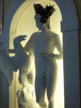 une sculpture de la Vierge logée dans une niche. Le mur est percé de quatre
