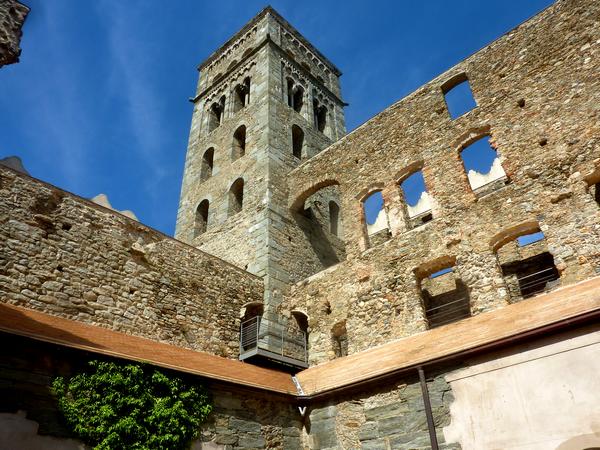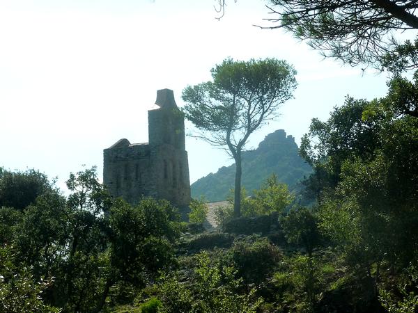 On fait une pause au pied de la Croix Blanche, on passe à l'aire de pique-nique du Mas Ventos, et après un arrêt pour admirer l'église Santa-Helena, on arrive au monastère de Sant Pere de Rodes. On retrouve Jacques qui est monté depuis El Port de la Selva et qui ayant fini la visite s'apprête à redescendre alors que nous prenons les billets pour entrer dans ce site très touristique. Nous prenons un bon moment pour la visite de ce monastère riche de son passé et de son architecture dont l'origine est de style roman, avec des chapiteaux d'influence corinthienne et un clocher carré du 12ème siècle d'influence lombarde.