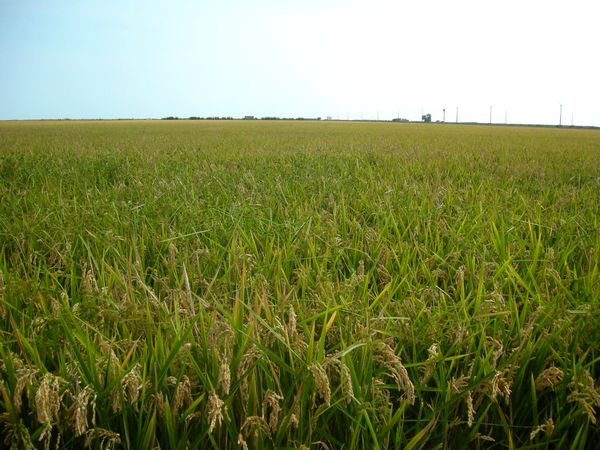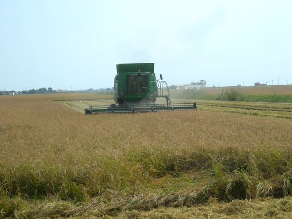 où passent des machines agricoles imposantes qui moissonnent les rizières qui s'étendent