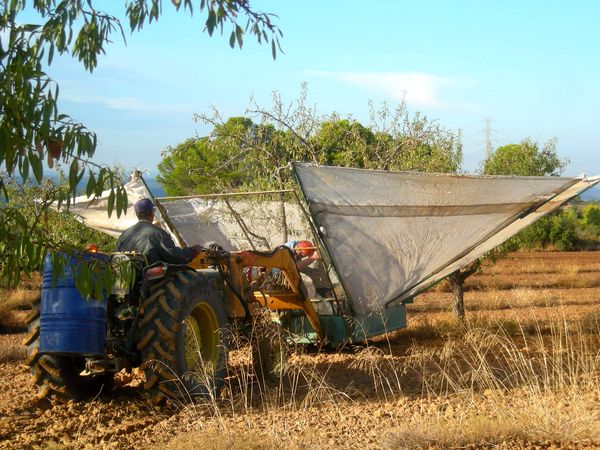 Je rencontre ces paysans qui récoltent les amandes avec leur tracteur. Il y a devant