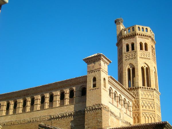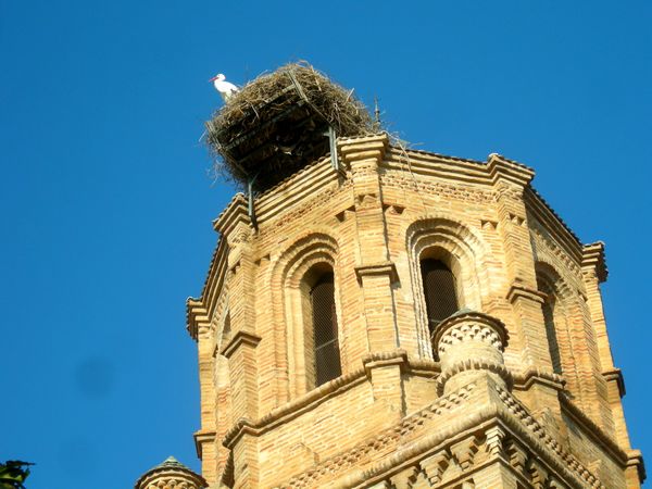 La cigogne juchée au sommet de la tour de l'église de Monzalbarba