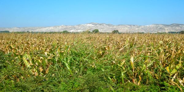 Au loin les montagnes désertiques qui s'élèvent au delà de la vallée de l'Ebre