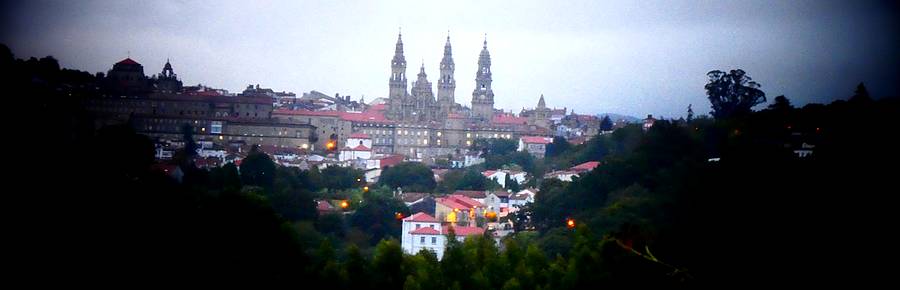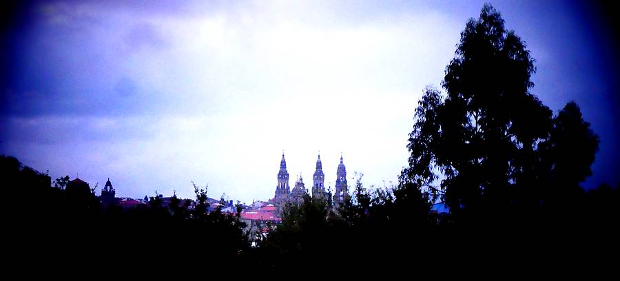 Arrivé sur une hauteur, j'ai une belle vue sur Santiago et les tours de la Cathédrale.
