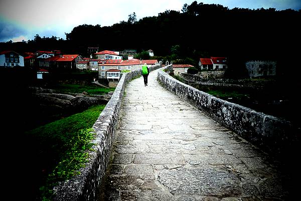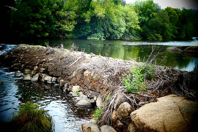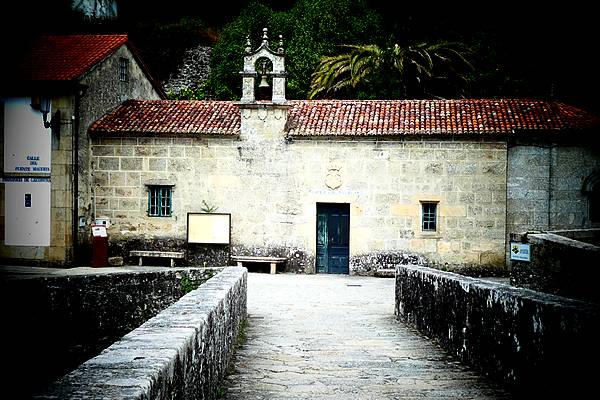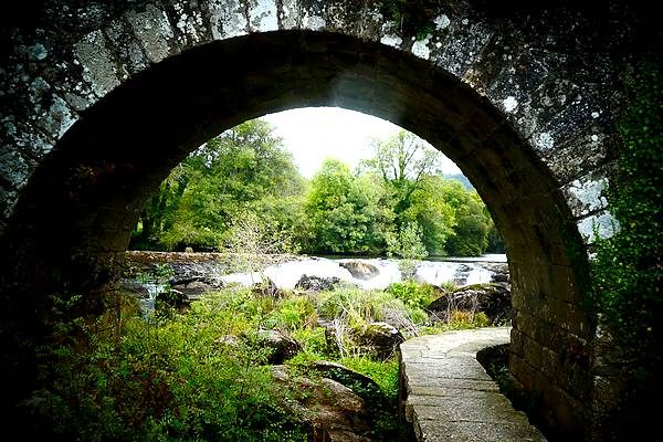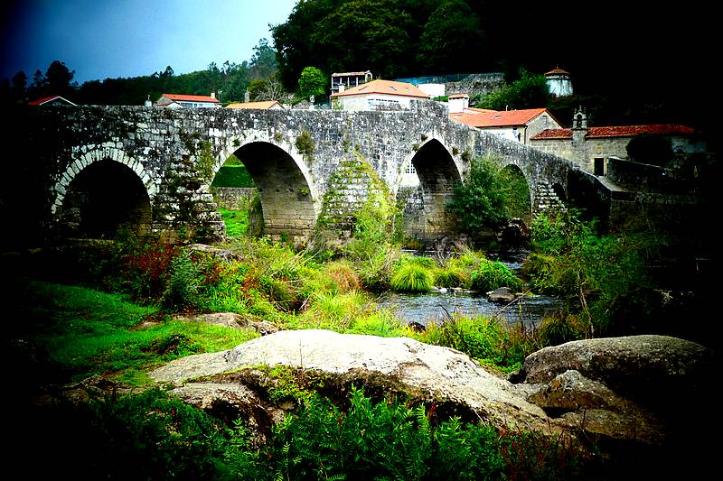 Passage d'un beau pont médiéval "Ponte Maceira" sur la rivière Tambre.
