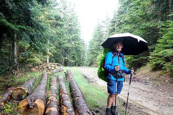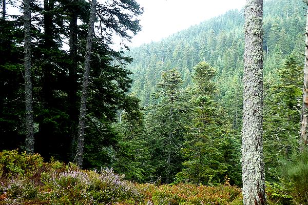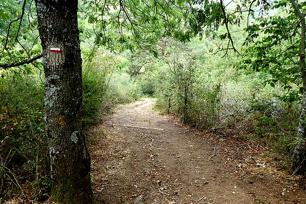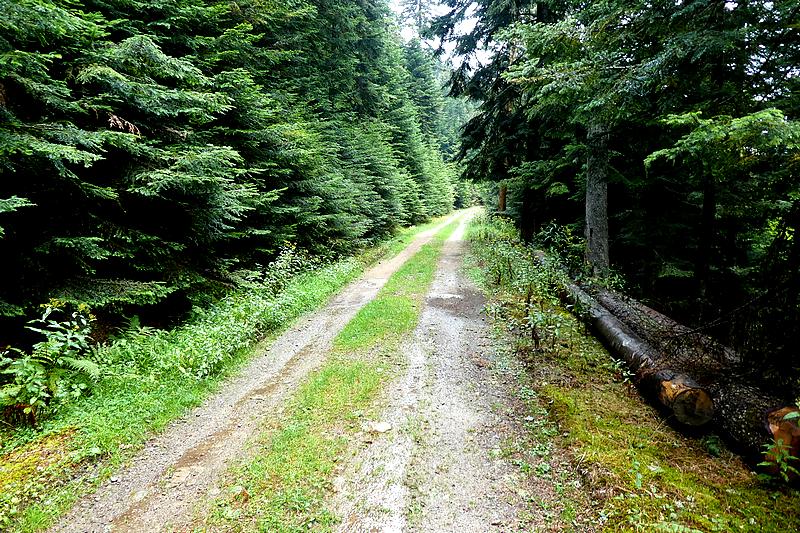 Après avoir retrouvé le balisage à la sortie de la localité, je prends un chemin en montée assez raide qui se transforme en une piste forestière qui continue en pente douce avec un sol recouvert d'aiguilles de pins et bordée de fougères et de myrtilliers. Il fait frais et le soleil est timide dans cet environnement qu'un vent léger balaie agréablement ! J'arrive alors sur une large piste goudronnée qui est une ancienne