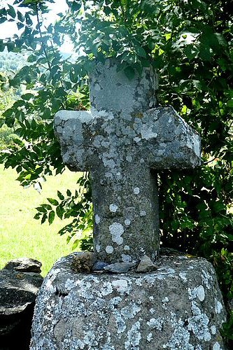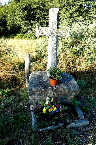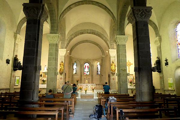 monts du Velay en forme de cônes. J'arrive en vue de Queyrières dominé par un imposant rocher sur lequel autrefois se dressait un château. Un peu plus loin, je traverse Monedeyres, village qui inspira Jules Romains dans l'un de ses romans et qui est connu pour son église qui n'a jamais été consacrée et dans laquelle on mange la soupe aux choux le 1er samedi de septembre ! Pour ma part, j'y touve avec bonheur une fontaine où coule une belle