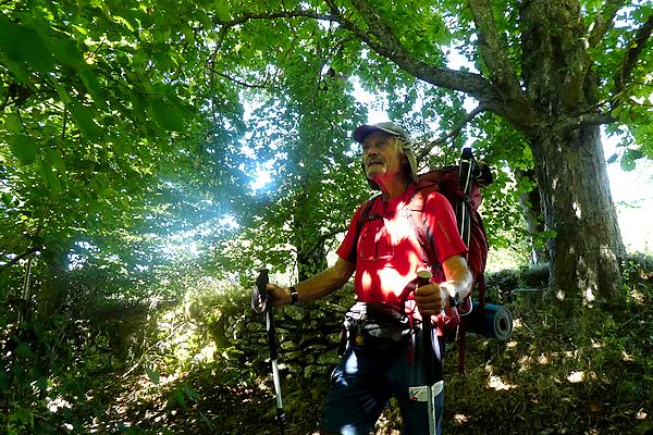 Je me dirige ensuite vers Queyrières situé à 7 kilomètres. Le chemin grimpe doucement au milieu des prairies, puis s'enfonce dans la forêt domaniale du Meygal pour arriver par un sentier bordé de noisetiers, de framboisiers et de genêts au point culminant de cette Via Gebennensis à 1286 m. Là, je retrouve le groupe de Saint-Régis qui fait une pause... Ils m'ont dépassé alors que moi-même je faisais une pause un peu plus tôt, allongé dans un pré !