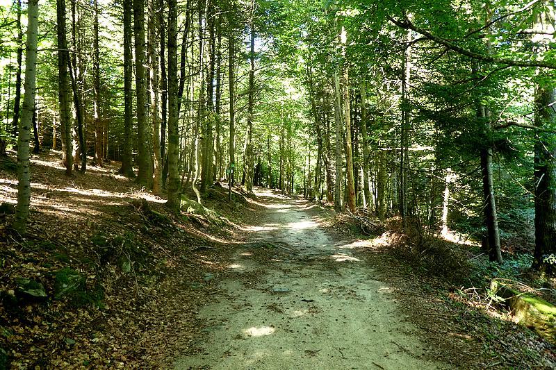 Je continue à descendre doucement sur un chemin caillouteux en sous-bois avant de retrouver un passage en forêt.