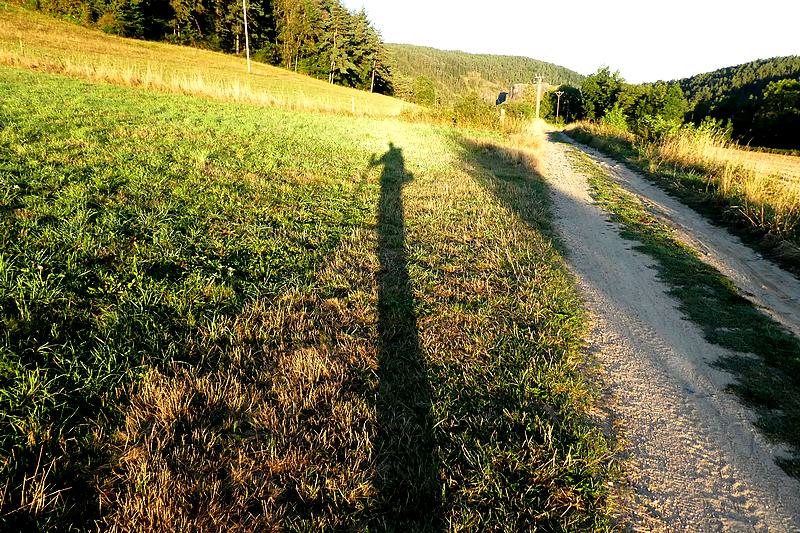 Après un bon petit-déjeuner pris avec mon hôte qui s'est levé de bonne heure pour me le préparer, je suis sur le Chemin à 7 h. La sortie du village est facile, le long d'une route assez circulante, mais il y a un bas-côté assez large. Je marche allègrement dans cette lumineuse clarté matinale qui inonde les prés