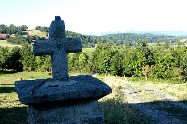 Je me trouve maintenant au milieu d'un espace assez dégagé avec tout alentour les monts du Velay. La route continue en descente faisant quelques zig-zag... C'est du goudron, mais c'est quand même plus agréable que les chemins caillouteux. Prairies, vaches, forêts, voilà mon environnements au long des kilomètres... Il y a aussi beaucoup de maisons d'habitations, des résidences secondaires et des fermes. A nouveau la route laisse place à un chemin caillouteux sur lequel il n'est pas facile de marcher, en pente douce, puis en montée jusqu'à un point haut d'où j'ai une belle vue sur la prochaine localité. Après un ou deux kilomètres, j'arrive à Saint-Germain-Laprade avec sa zone