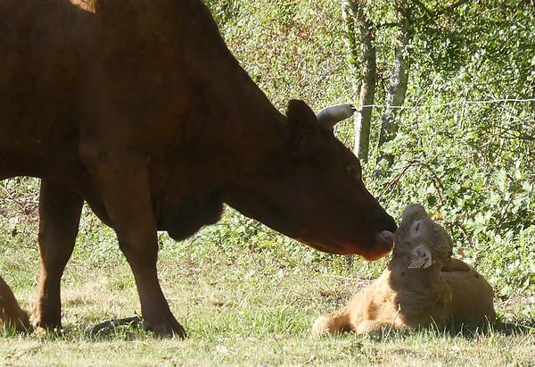 J'arrive à une rivière La Sumène que je traverse en équilibre sur des grosses pierres, c'est un passage un peu risqué, il vaut mieux ne pas glisser ! Par temps de pluie, je ne sais pas si cela est possible ! Je continue au milieu de prairies et j'arrive à un premier hameau où je prends une petite route goudronnée qui descend dans un vallon couvert de chênes et de sapins. Je continue toujours au milieu de ces prairies où des vaches broutent consciencieusement... Le soleil a émergé au-dessus des frondaisons. J'arrive de nouveau à la même rivière La Sumène que je traverse cette fois sur un pont. Cette petite route monte ensuite assez fortement jusqu'au prochain hameau.
