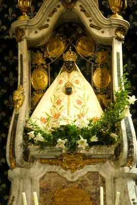 la Vierge Noire trônant au-dessus de l'autel au fond de l'abside...