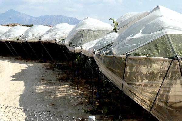 Les immenses serres qui abritent des milliers de grappes de raisin...