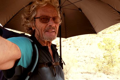 Il fait très chaud, mais j'ai installé mon parasol sur le sac ce qui me protège bien des rayons ardents du soleil. Je fais plusieurs