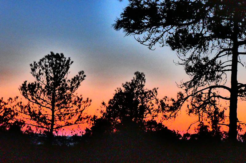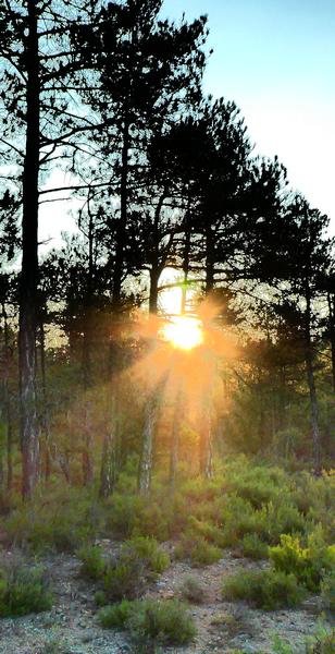 l'horizon derrière la forêt de pins puis le soleil émerge et réchauffe peu à