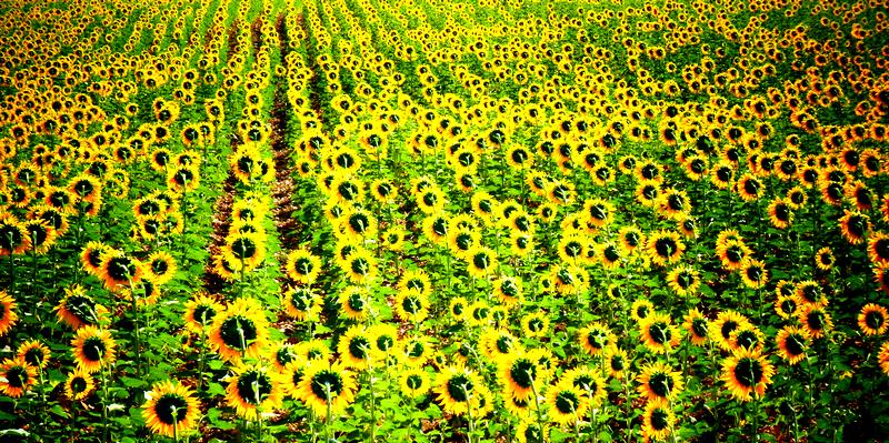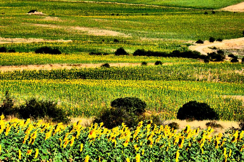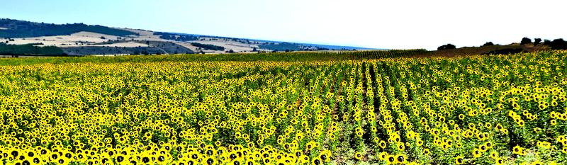 des tournesols à peine en fleurs. C'est un beau paysage vallonné avec ce