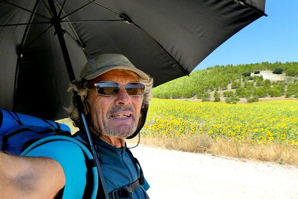 Je termine les derniers kilomètres sur une piste caillouteuse avec mon parasol,