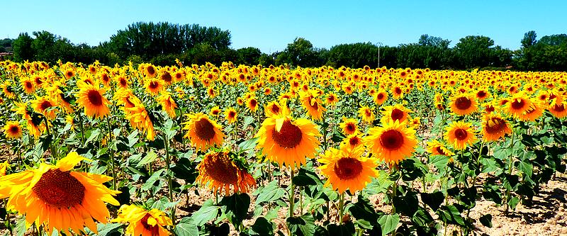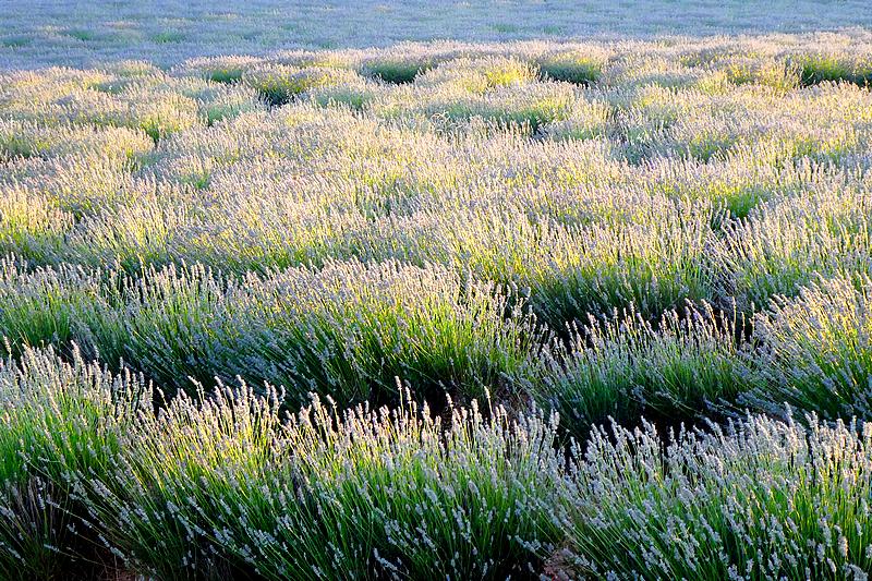 Je quitte l'Albergue à 6 h. Je prends une petite piste campagnarde qui traverse des champs de céréales et de tournesols. Il fait frais, le ciel est bien dégagé, je marche à un bon rythme. Après 1h30, j'arrive à un immense champ de lavandes en fleurs qui s'étend sur plusieurs kilomètres, protégé par un muret avec un grillage de 2 m de hauteur. C'est un champ aussi bien protégé qu'un site militaire ! Le soleil se lève sur ces lavandes faisant ressortir encore plus leurs belles couleurs...