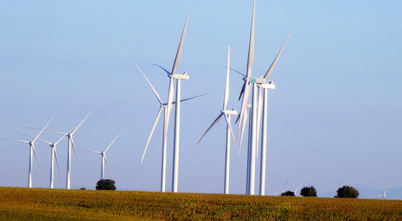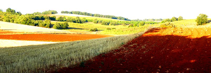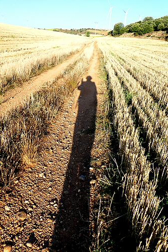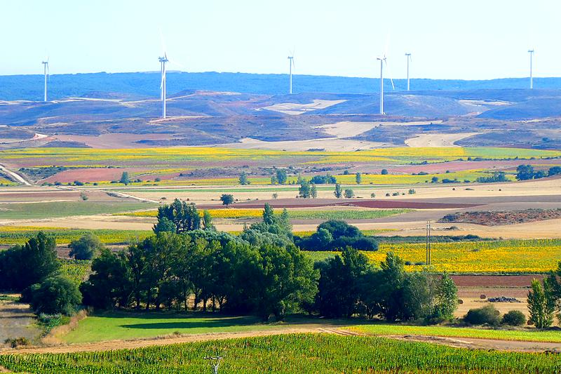Il reste 5 kilomètres avant d'arriver au premier pueblo. Je traverse une zone boisée et j'arrive près du parc d'éoliennes qui sont comme les gardiennes de ce haut plateau. J'arrive à un sommet d'où la vue s'étend sur ces grands espaces agricoles qui mélangent les belles couleurs que forment les champs de luzerne, les tournesols, les champs moissonnés, les bosquets de chênes verts et autres arbustes...