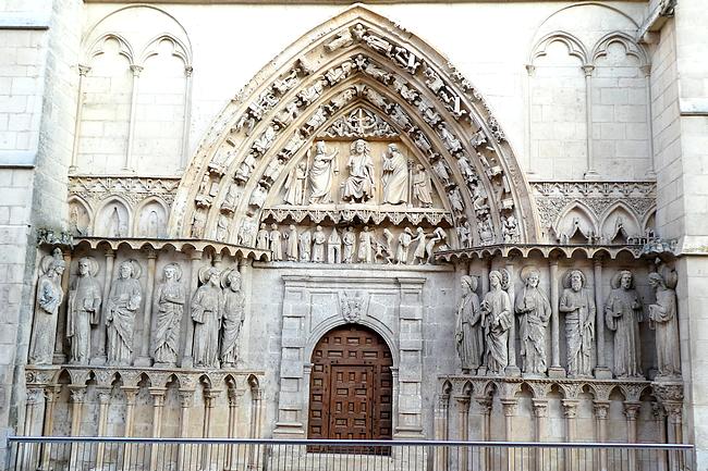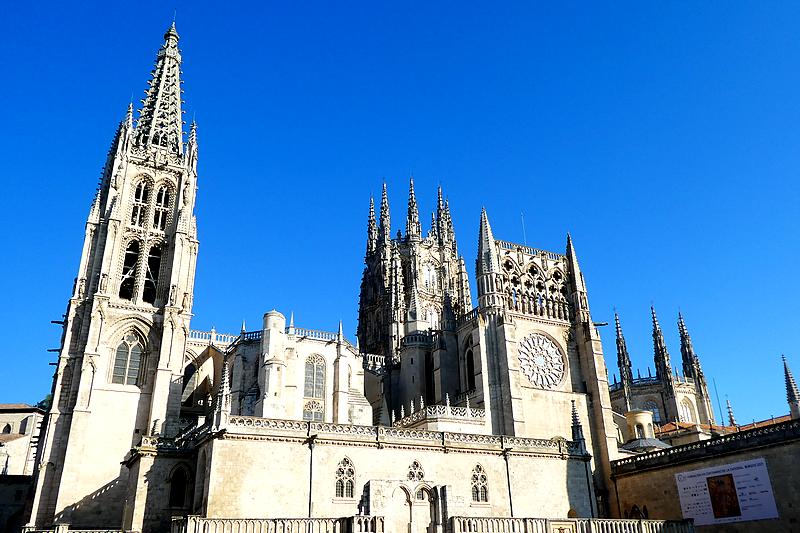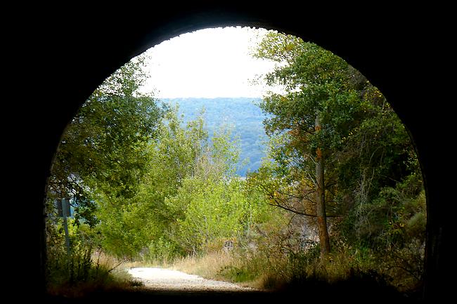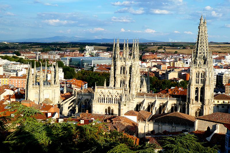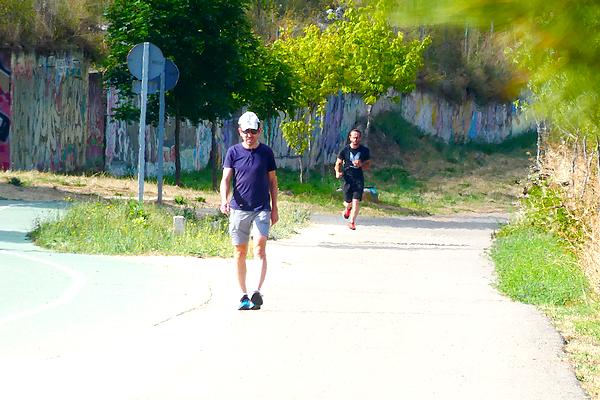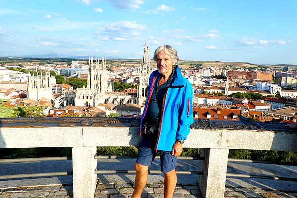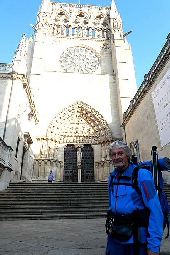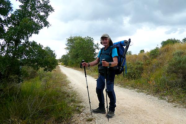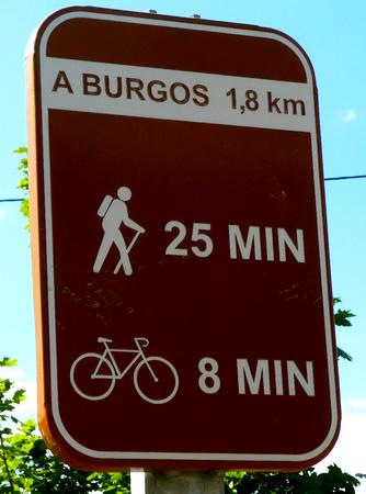Ensuite, c'est l'itinéraire de la Via Verde, une ancienne voie ferrée qui reliait Santander à la Méditerrannée et qui a été transformée en piste piétonnière et cycliste. Le temps est nuageux et chaud, et 14 kilomètres sur cette piste c'est long et un peu monotone, avec l'avantage qu'il n'y a aucun dénivelé. Par inadvertance, au lieu de couper à un moment où la piste fait une large courbe je me rajoute 2 kilomètres ! Bon, le moral est bon, j'ai suffisamment d'eau et je peux faire des pauses régulièrement... Il y a un passage sous un tunnel long de 650 mètres dans lequel je mets ma lampe frontale. Je longe le dernier pueblo de cette étape, Cardeñadijo et j'approche alors de Burgos. J'ai téléphoné à Rodrigo, ce jeune espagnol rencontré il y a 2 jours qui doit venir à ma rencontre et lorsque j'arrive dans les faubourgs de Burgos je le vois arriver sur le chemin face à moi...