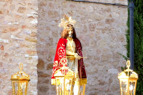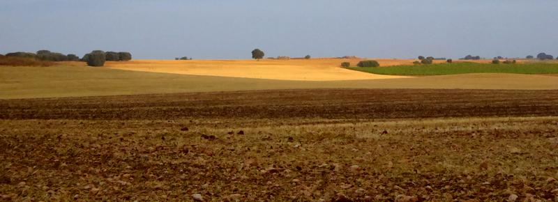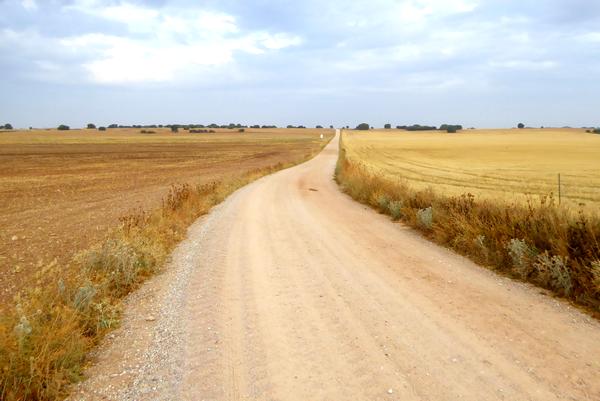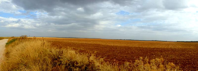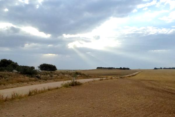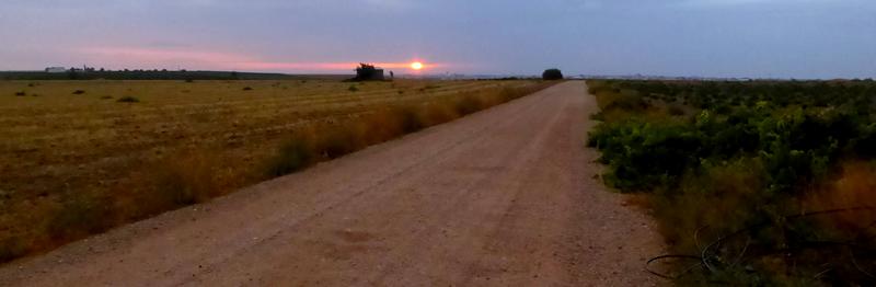 Cette journée commence par une mésaventure dont je suis le seul responsable : En relevant le store de la chambre, j'ai laissé rouler sur le rebord de la fenêtre une bouteille d'eau fraîche ainsi qu'une bouteille de Horchata qui sont tombées dans une petite cour à laquelle je n'avais pas accès. J'en ai été quitte pour remplir au robinet ma poche de deux litres. Je quitte l'Albergue à 6h15. Il pleut, je me réfugie Plaza Mayor sous les arcades du Museo de Obra Grafica. La pluie s'arrête après quelques minutes...Je descends la Calle San Sebastian pour rejoindre la Ruta de Don Quijote. Je marche avec la frontale jusqu'à 7h15. Le temps est toujours à la pluie, mais plus une goutte au cours de cette journée ! Le parcours est agréable, au milieu des vignes et des champs qui s'étirent à perte de vue. Je me régale de quelques grappes de bon raisin blanc que mon œil exercé a vite fait de dénicher...