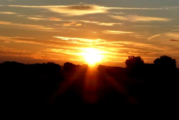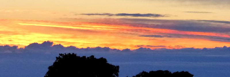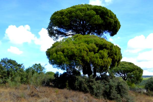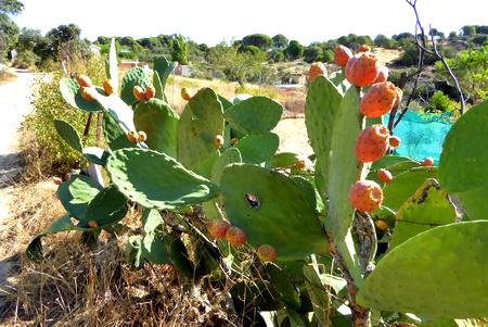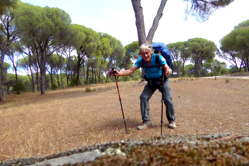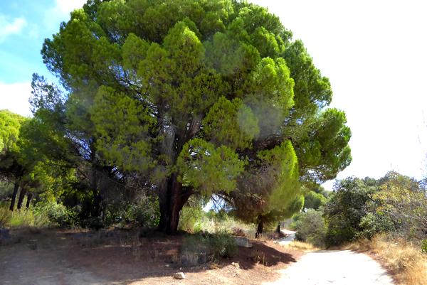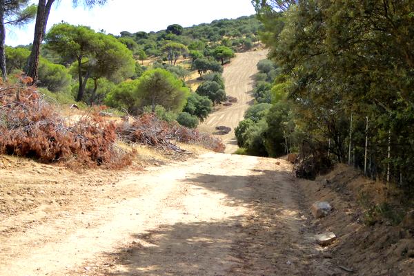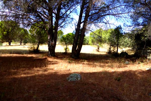 Après quelques dénivelés, j'arrive par un beau chemin de campagne sur un plateau au milieu des chênes verts et j'ai alors droit à un de ces beaux levers de soleil qui vous met en joie pour la journée...C'est un matin où l'on est heureux d'être sur le Chemin ! J'arrive à Almorox vers 9h. Pause dans un bar avec coca et olives et je repars pour ce qui va être une des étapes les plus difficiles que j'aurai jamais parcourue ! L'environnement a changé, le chemin monte et descend au milieu de petites collines, passe au milieu de propriétés entourées de jardins et de petites cultures...Je suis ravi de ce changement de décor, et puis le balisage commence à être déficient...Je fais quelques allers-retours avec ici ou là des treilles qui me procurent quelques belles grappes de raisin blanc...Le balisage devient presqu'inexistant et j'ai du mal à me repérer avec le guide... Cependant je ne peux qu'être charmé par cette forêt de pins majestueux dans laquelle je m'enfonce...Devant une propriété un chien noir me tourne autour très hargneux...Je sors mon sifflet ce qui le surprend et quelques moulinets avec mon bâton à la façon Don Quichotte auront raison de son agressivité...