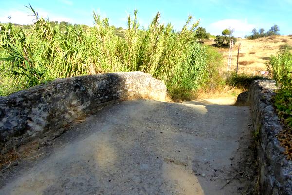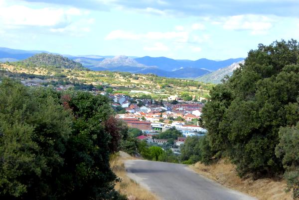 C'est alors que commence le cauchemar avec des dénivelés de fou sur des terrains défoncés par les bulldozers... Je vérifie ce qui me reste comme eau dans ma poche, car la chaleur est assez forte et dans les montées abruptes, j'ai vite la gorge sèche et boire quelques gorgées d'eau fraîche est indispensable ! La galère se pousuit sur ces chemins qui ne ressemblent plus à rien et je cherche désespérément quelque balise...Mais il faut continuer et j'attaque vaillamment une pente après l'autre et les descentes sont même dangereuses...Je me demande bien pourquoi on fait passer les pèlerins par cet itinéraire...J'arrive à un panneau indiquant 6, 3 km ! Alors là je suis vraiment déçu ! Je croyais avoir fait plus de kilomètres ! Puis un autre panneau indiquant 4,8 km...C'est long et j'ai l'impression de ne pas avancer... Heureusement que j'ai pris assez d'eau, car je commence à être épuisé, et boire me permet d'affronter ces difficultés ! Je rêve d'une bonne cerveza glacée...Enfin après une descente aux enfers (dénivelé très raide...), j'arrive sur un chemin et là je sens que le pueblo n'est plus très loin ! Encore une belle descente sur une route goudronnée et voilà l'entrée de San Martin de Valdeiglesias.